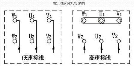 2、雙速風(fēng)機(jī)接線方法:本廠雙速風(fēng)機(jī)所配雙速電機(jī)其定子繞組為△/YY(或Y/YY)接法。接線圖如下: